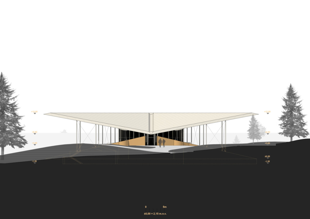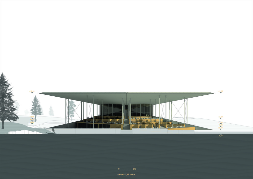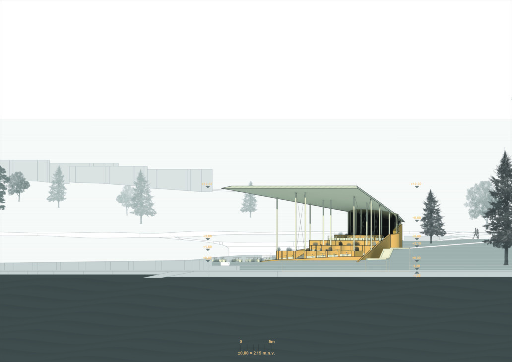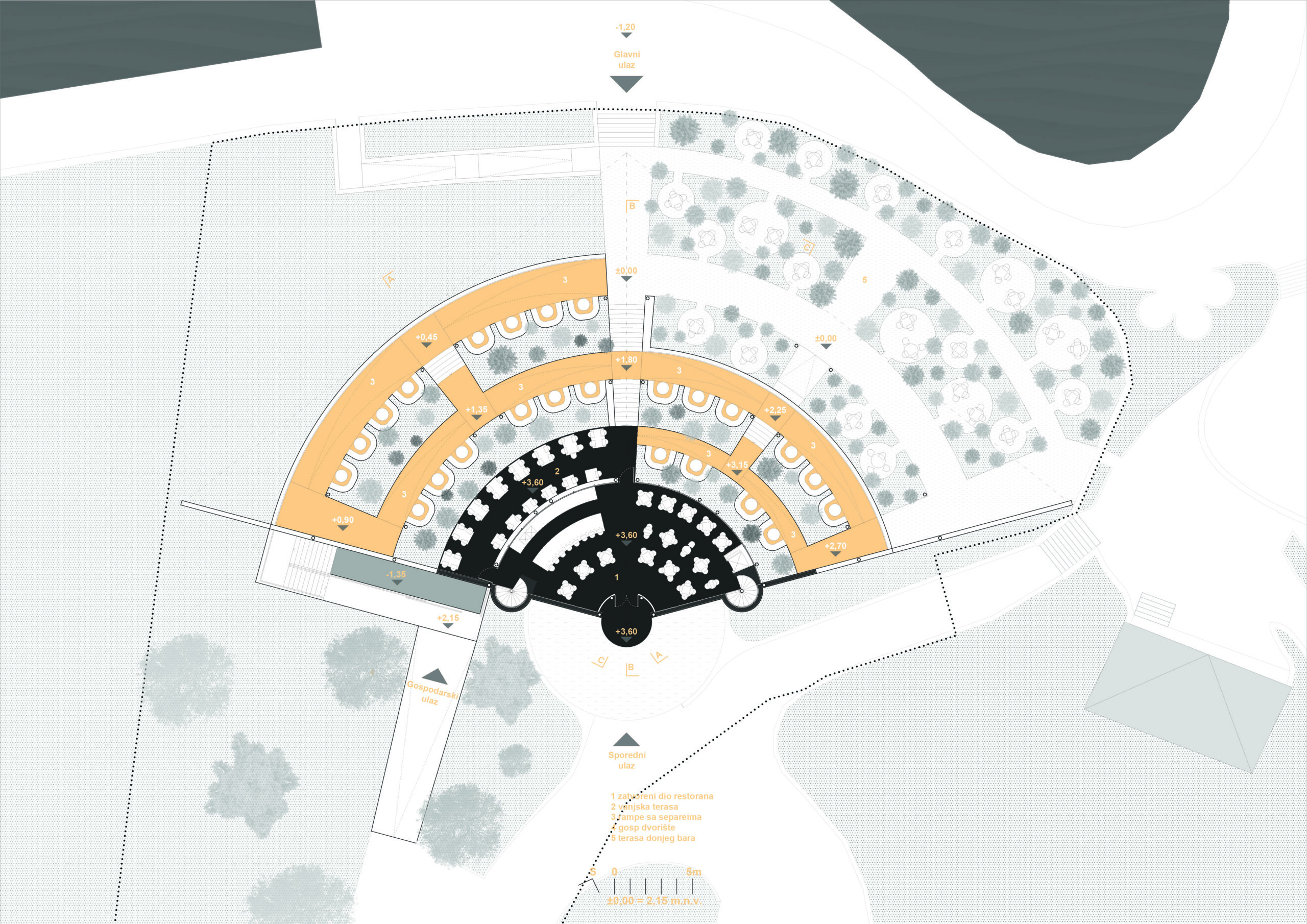 Lokacija projekta nalazi se na otoku Krku u Malinskoj, točnije u mjestu Haludovo, kraj hotela Palace arhitekta, profesora Borisa Magaša. Projekt je zamišljen kao donji ulaz u kompleks, odnosno donja porta kojoj se pristupa sa šetnice uz more. Namjena projekta je restoran sa popratnim vanjskim barom. Restoran se sastoji 2 etaže – podruma i prizemlja koji se kaskadno spuštaju prema moru – sjevernoj uvali. Kaskade funkcioniraju kao terase sa separeima između kojih su postavljeni nasadi mirisnog bilja poput lavande, smilja, ružmarina i slično. Prostor je ujedno definiran kretanjem – odnosno rampama koje se šire i sužavaju, ovisno o poziciji kaskade i količni separea koje opslužuju. Gornja etaža ljeti se može u potpunosti otvoriti dok u jesen i zimu ima mogućnost zatvaranja. Podrumska etaža funkcionira kao servisna – sadrži prostorije kuhinje, spremišta, strojarnice, garderobe osoblja te sanitarije za goste.